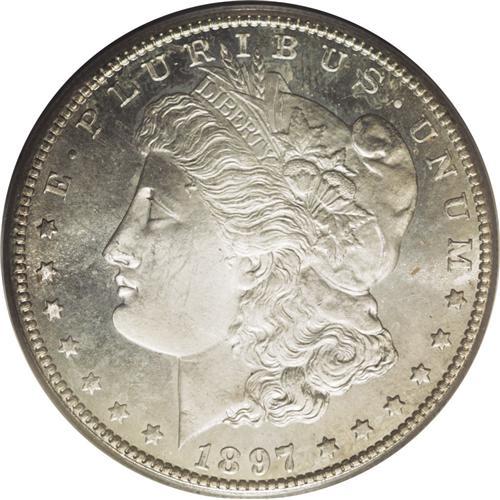 <B>1897-S<img border='0' src='http://www.heritagecoins.com/images/star.gif' width=10 height=10>$1> MS67 PCGS.</B></I> The razor-sharp striking details on this splendid Superb Gem include the eagle's breast feathers, the hair above Liberty's ear, and the amazingly crisp denticles. The shimmering fields are especially clean, with more than a suggestion of reflectivity contrasting against the frosty features. A thin, translucent coating of creamy-gray patina covers each side, possibly preventing the Prooflike grade designation. Conditionally scarce and virtually nonexistent any finer. Population: 21 in 67, 2 finer (7/06).