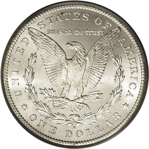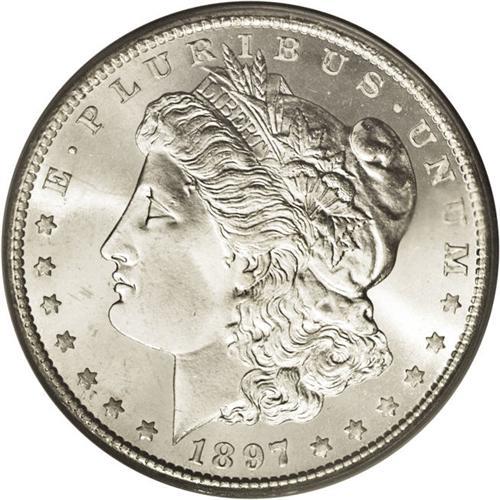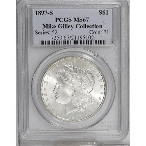 <B>1897-S<img border='0' src='http://www.heritagecoins.com/images/star.gif' width=10 height=10>$1> MS67 PCGS.</B></I> This is a coin that generally comes nice, in terms of strike, luster, and overall appearance, and this Superb Gem piece does not disappoint. Swirling luster envelops both sides of this brilliant example, the strike is well executed, and the eye appeal is top-notch. Very nearly the finest obtainable of this in-demand issue, superseded by only two pieces finer at PCGS and none at NGC (6/06).