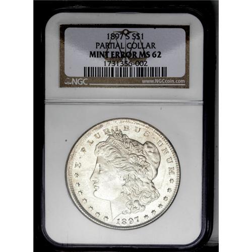 <B>1897-S<img border='0' src='http://www.heritagecoins.com/images/star.gif' width=10 height=10>$1> Morgan Dollar--Partial Collar--MS62 NGC.</B></I> This crisply struck and thoroughly lustrous silver dollar is gently toned in golden tints. Slightly uncentered toward 5 o'clock. Less abraded than customary for the MS62 level, and a find for the Morgan dollar error specialist.