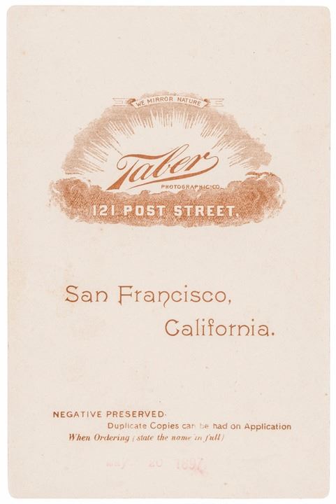 Adolph Sutro (1830-1898), was the first Jewish Mayor of San Francisco (1894-1898). Best known for the various San Francisco landmarks and areas that still bear his name. This beautiful quality, 4.25” x 6.5” Cabinet Card shows Sutro in chest-up pose, text below image reads, “Taber No. 121 Post Street bet. Kearny Street and Grant Avenue, San Francisco.” Backstamp reads, “We Mirror Nature Taber Photograph CO 121 Post Street, San Francisco, California. Negative Preserved. Duplicate Copies can be had on Application. When Ordering (state the name in full)”. A faint printed red date stamp at reverse bottom reads, “May 20 1897”. A gorgeous quality image and well printed card with nice contrast that is excellent for display.