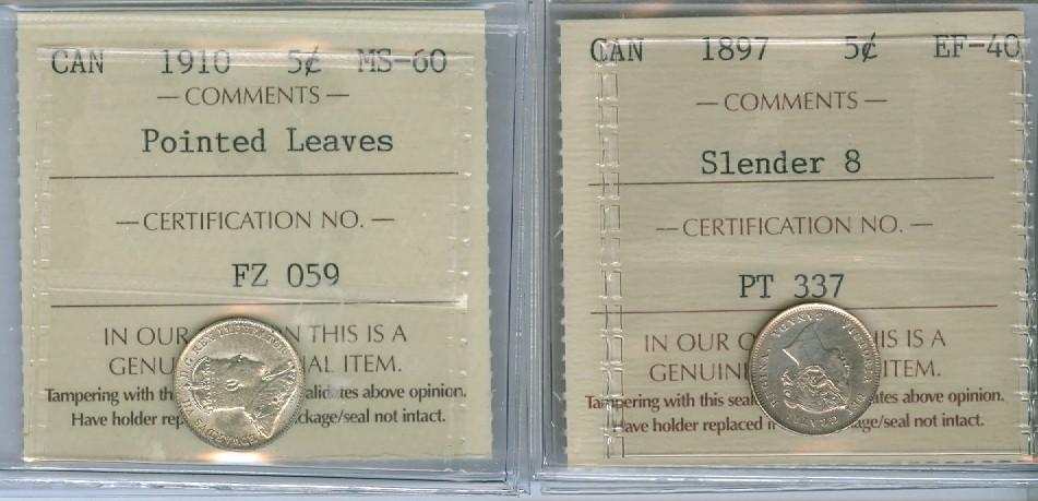 1897 Slender 8 EF40 & 1910 PL MS60 5¢. Lot of 2 coins both ICCS graded.