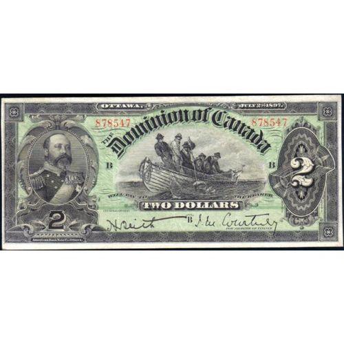 1897 Two Dollars Courtenay, Brown Back, Series B, DC-14b, Serial Number 878547 B, VF. A rather crisp and bright note with a 1.5mm tear in the top margin and close cut on the left