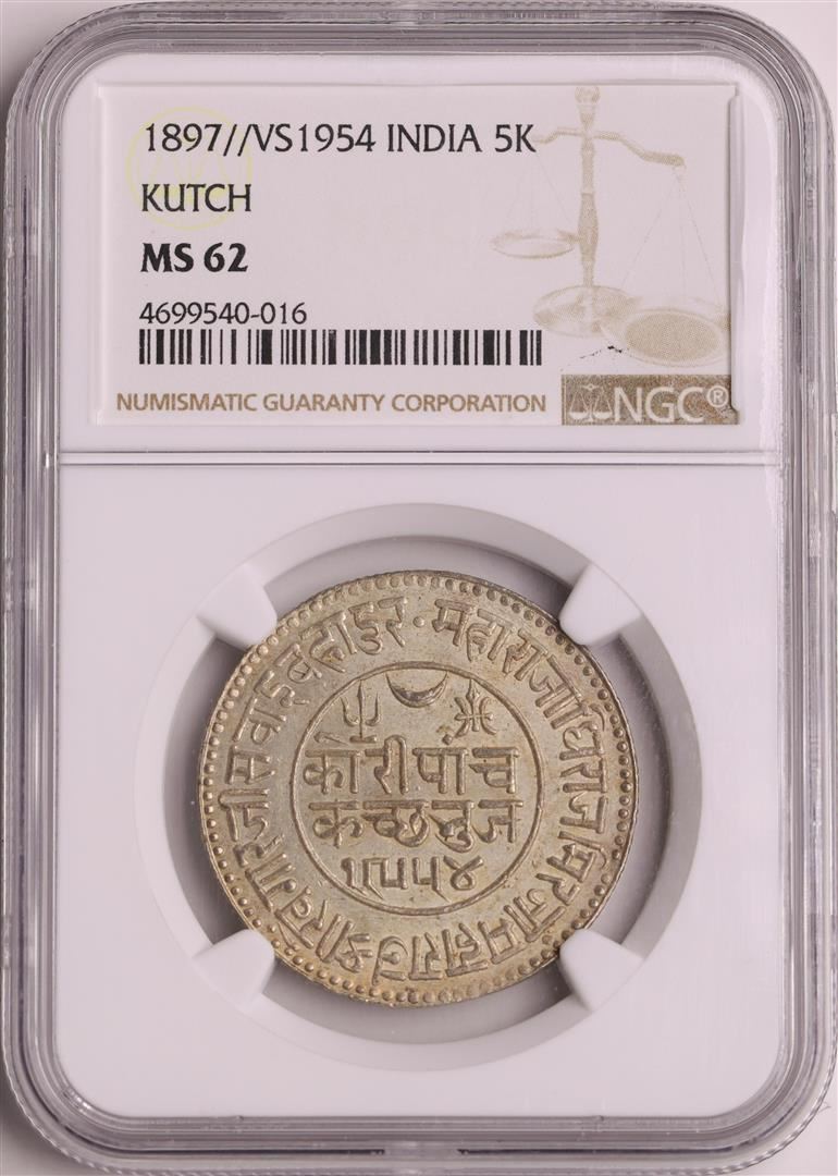 One 1897//VS1954 India 5 Kori Silver Coin NGC MS62. NGC Certified.