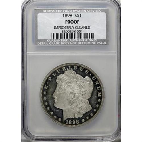 <B>1898 $1 --Improperly Cleaned--NCS. Proof.</B></I> Fine hairlines show up under magnification on this color-free proof dollar. The design features display exquisite detail, along with light friction on the high points. Strong field-motif contrast is evident on both sides.<BR><BR><B>Coin Engraver:</B> George T. Morgan<BR><BR><b>Shipping:</b> Coins & Currency (<a target="_blank" href="http://www.heritageauctions.com/common/shipping.php">view shipping information</a>)