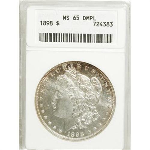 <B>1898 $1 MS65 Deep Mirror Prooflike ANACS.</B></I> Deep Mirror Prooflikes from this date are extremely elusive, especially those graded above MS64. This appealing Gem is remarkable both for the depth of its reflective fields and for the smooth, clean cheek of Liberty. A bit of haziness is noted in the fields, along with lovely deep violet and gold peripheral toning. <BR><BR><b>Shipping:</b> Coins & Currency (<a target="_blank" href="http://www.heritageauctions.com/common/shipping.php">view shipping information</a>)