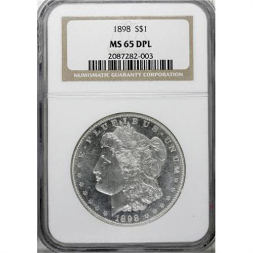 <B>1898 $1 MS65 Deep Mirror Prooflike NGC.</B></I> Brilliant with deeply reflective fields that yield mild contrast with the devices. The breast feathers and hair detail are a sight to behold as they are crisp throughout. A few shallow marks preclude an even higher grade level. Census: 32 in 65 Deep Mirror Prooflike, 5 finer (1/08).<BR><BR><b>Shipping:</b> Coins & Currency (<a target="_blank" href="http://www.heritageauctions.com/common/shipping.php">view shipping information</a>)