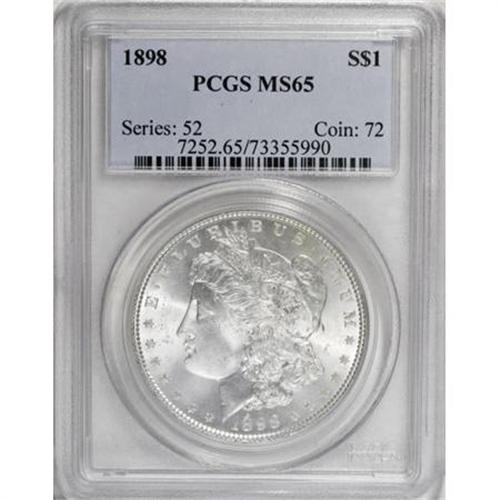 <B>1898 $1 MS65 PCGS.</B></I> PCGS Population (1708/503). NGC Census: (1985/345). Mintage: 5,884,735. Numismedia Wsl. Price for NGC/PCGS coin in MS65: $180. (#7252)<BR><BR><B>Coin Engraver:</B> George T. Morgan<BR><BR><b>Shipping:</b> Coins & Currency (<a target="_blank" href="http://www.heritageauctions.com/common/shipping.php">view shipping information</a>)