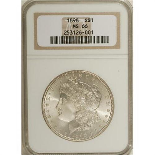 <B>1898 $1 MS66 NGC.</B></I> NGC Census: (323/11). PCGS Population (452/23). Mintage: 5,884,735. Numismedia Wsl. Price for NGC/PCGS coin in MS66: $600. (#7252)<BR><BR><b>Shipping:</b> Coins & Currency (<a target="_blank" href="http://www.heritageauctions.com/common/shipping.php">view shipping information</a>)