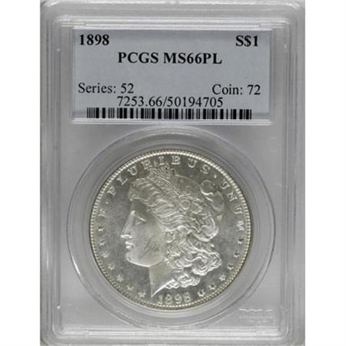 <B>1898 $1 MS66 Prooflike PCGS.</B></I> This Premium Prooflike Gem example boasts remarkably bright fields and nicely frosted devices. Sharply defined, including the hair over Liberty's ear and the eagle's breast feathers. A few scattered abrasions are seen, as expected, but none are particularly severe. Population: 11 in 66 Prooflike, 0 finer (7/07).<BR><BR><B>Coin Engraver:</B> George T. Morgan<BR><BR><b>Shipping:</b> Coins & Currency (<a target="_blank" href="http://www.heritageauctions.com/common/shipping.php">view shipping information</a>\)