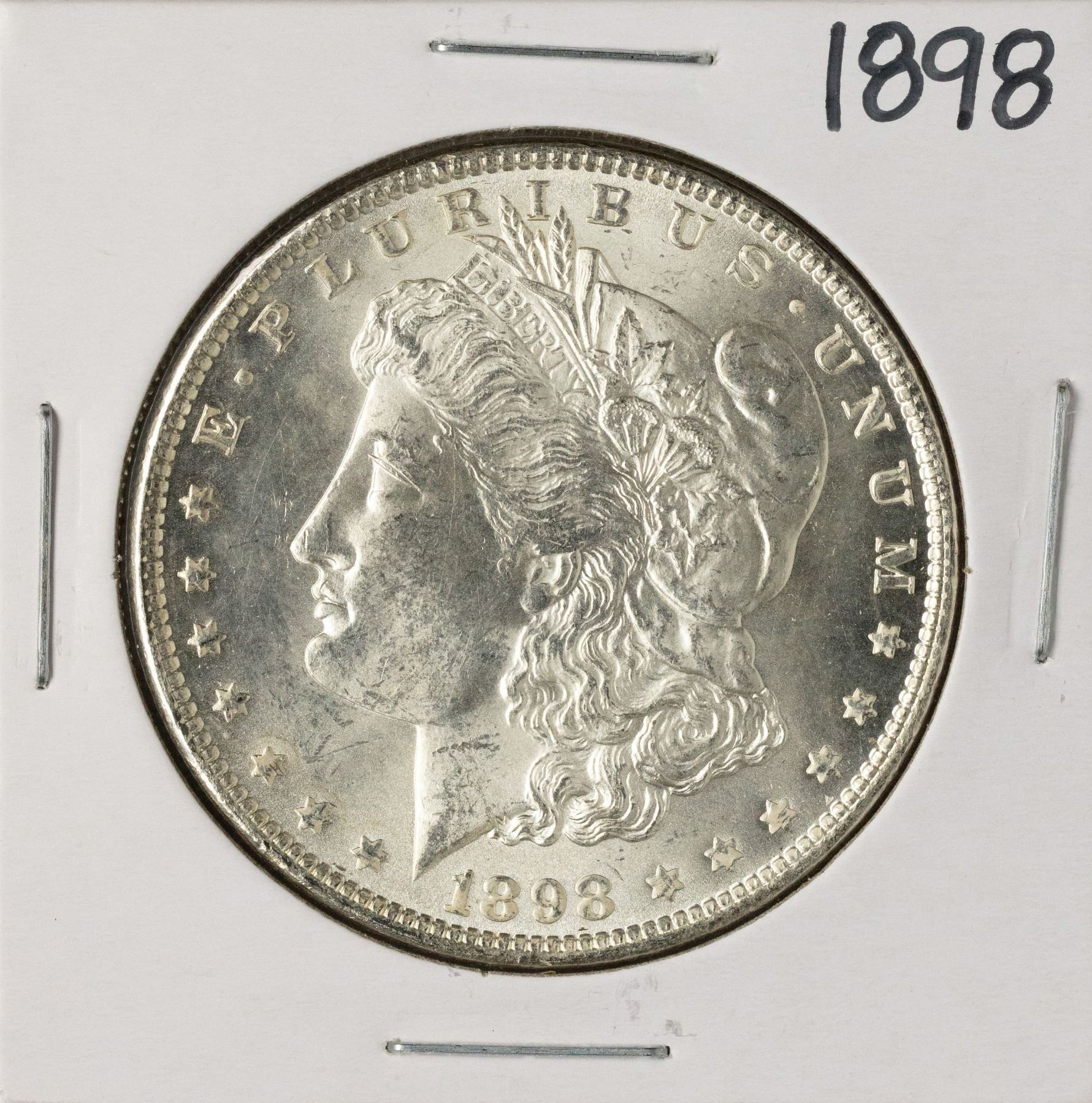 One 1898 $1 Morgan Silver Dollar Coin.