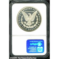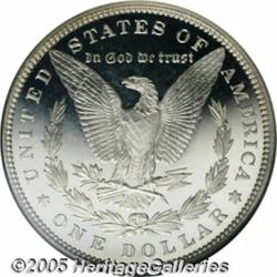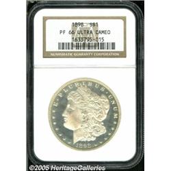 <B>1898<img border='0' src='http://www.heritagecoins.com/images/star.gif' width=10 height=10>$1 PR66 Ultra Cameo NGC.</B></I> This year is well known for well produced proofs in all denominations, and this piece is exceptional even for an 1898. The devices are chalk-white and contrast sharply against the "blackness" seen in the illimitable depth of mirrors in the fields. Brilliant throughout, this is undoubtedly one of the most visually pleasing Morgan Dollars known and it would be perfect for a 19th century cameo type set. Population: 10 in 66 Ultra Cameo, 16 finer (2/05).