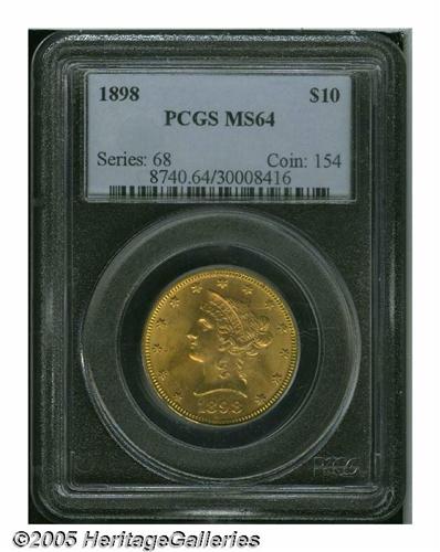 <B>1898<$10> MS64 PCGS.</B></I> A lovely near-Gem with a meticulous strike and minimally unabraded surfaces that display impressive luster and peach-gold patination. Although regarded as a common date by non-specialists, the 1898 is nonetheless scarce in this better grade. Population: 41 in 64, 6 finer (5/05).<BR><I>From The Dr. Theodore Almquist Collection.</B></I>