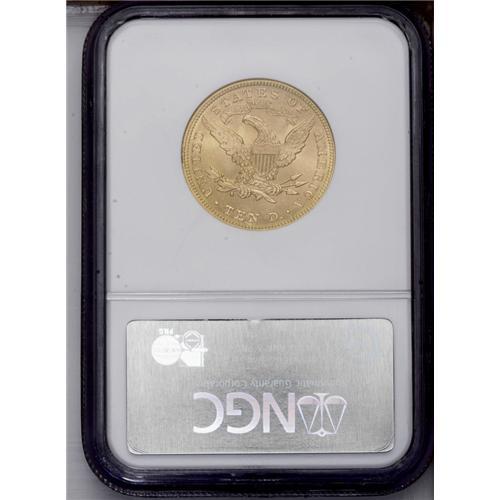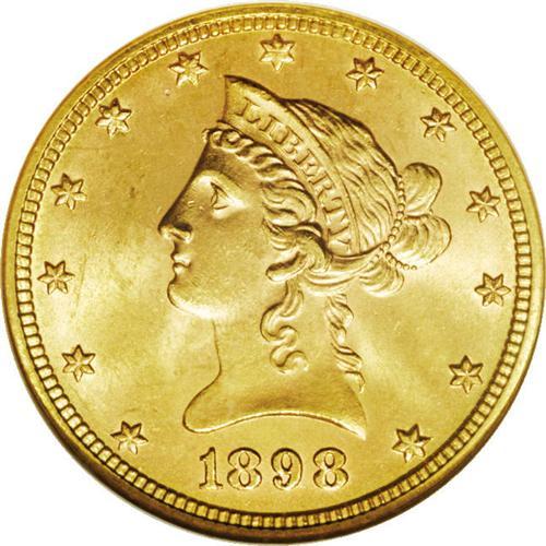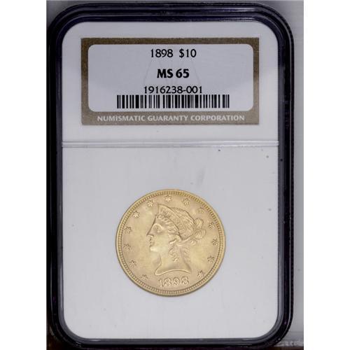 <B>1898 $10 MS65 NGC.</B></I> A well struck coin that boasts ample mint luster and excellent eye appeal. The surfaces really set this one apart, with minimal signs of contact, and Liberty's face and neck are very pleasing to behold. Identifiable by a thin scuff which curls around the inner points of star 3. For the collector who demands Gem quality, the present coin represents quite an opportunity. Census: 20 in 65, 6 finer (1/06).