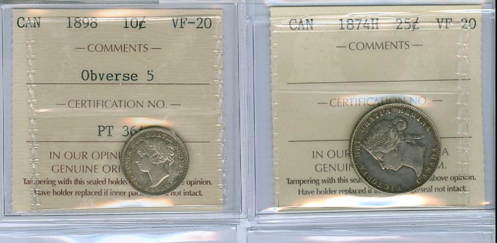 1898 10¢ Obv 5 & 1874H 25¢. Lot of 2 coins both ICCS VF20