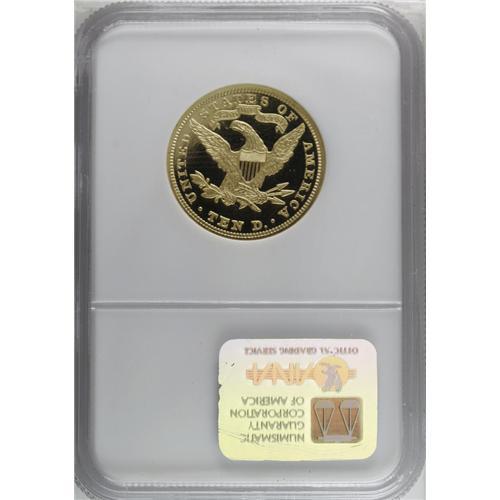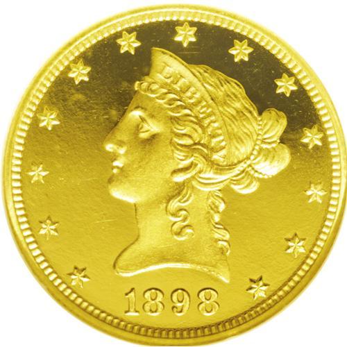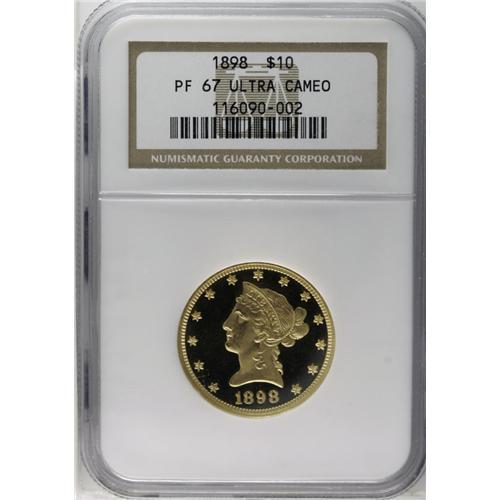 <B>1898<$10> PR67 Deep Cameo NGC.</B></I> Approximately 30 examples survive from an original proof mintage of just 67 eagles in 1898, and few of the survivors can hold a candle to this example for its remarkable technical quality and overall aesthetic appeal. This example is far finer than the Bass, Trompeter, or Pittman Collection coins. In fact, if it were possible, we suggest that this coin may be too perfect. There are no visible defects, whether mint-made or post-striking. Those who are involved in pedigree research always seek some individual characteristic, often a lint mark and occasionally a different type of blemish, to compare with other specimens for plate matching. This coin has no such imperfections, save for a tiny squiggle in the left obverse field that will probably not be visible in a photograph.<BR> Like the other 1898 proof gold coins in this sale, the present specimen is fully defined, right down to the fine die polishing lines on the coronet below and behind IBE of LIBERTY. The fields are deeply mirrored with a wavy appearance, and they contrast nicely with the frosted devices. In fact, every individual element of the design has heavy mint frost, except for a tiny bright spot on Liberty's chin, which is apparently as struck. In fact, David Akers described this identical characteristic when describing the Pittman Collection specimen. Census: 3 in 67, 1 finer (6/06).<BR><I>From The Belle Glade Collection.</B></I> <BR><BR><B>Important notice:<