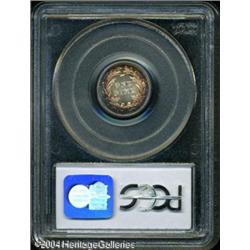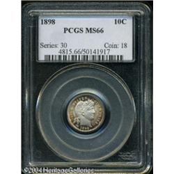 1898 10C MS66 PCGS. Deep electric-blue and reddish <B>1898 10C MS66 PCGS.</B></I> Deep electric-blue and reddish-brown toning gravitates to the margins of this wonderfully struck and impeccably preserved Barber dime. A gorgeous example! Population: 19 in 66, 4 finer (10/04). <BR><BR><B>Important notice:</B> Heritage usually auctions material at the rate of 200-250 lots per hour. On some occasions eBay Live bid software or the Internet may not be able to keep up with the pace of the auction. We recommend placing a realistic absentee bid now as insurance to avoid disappointment. Occasionally the auctioneer may eliminate or reject an eBay Live bid, and the auctioneer may also reopen a lot after the close of the eBay live bidding (usually because we missed an audience bid), and may reject your bid even if it shows you as the winning bidder. By bidding via eBay Live, you agree that Heritage may award the lot to another bidder at its sole discretion under the circumstances described above or any other reasonable circumstances. Since eBay bids are not shown to us until we open the lot on the floor, we treat those bids just like floor bids. In most cases the floor responds before the eBay bid is presented to us, due to Internet lag time, so for consistency we have made it a policy that floor bids are always considered first over tie eBay live bids. Also please note that all Heritage lots purchased through eBay Live carry a 20% Buyer's Premium. Please make sure you read the Terms and Conditions before you bid. This lot is being auctioned in conjunction with a live floor auction by Heritage Galleries & Auctioneers. All final auction and invoice information will be supplied by Heritage Galleries & Auctioneers, and all other information should be considered preliminary. Lot:5766