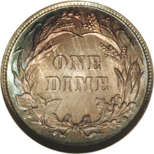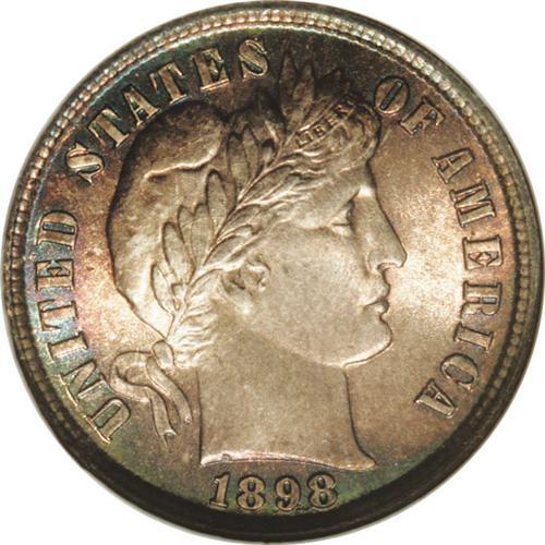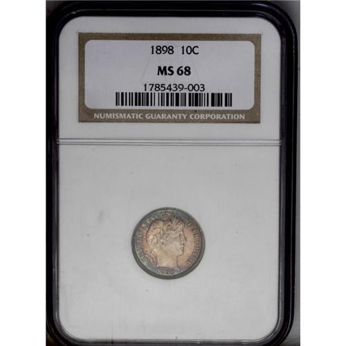 <B>1898<10C> MS68 NGC.</B></I> An intensely toned Superb Gem with frosty luster beneath rich ivory, sunset-orange, and sky-blue color. This example is fully struck with pristine surfaces. Minor die cracks can be seen on both sides, some in the fields and others through the devices. This is a relatively common date, although the present example is the only MS68 certified by either PCGS or NGC. This is an example of the Normal Date variety for the year. Walter Breen reported a second variety for the date, which he termed a possible overdate, although its overdate status is highly doubted.