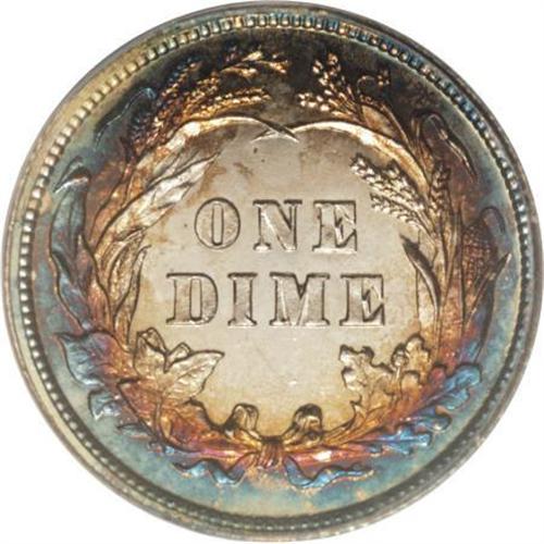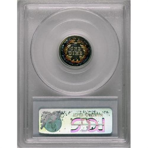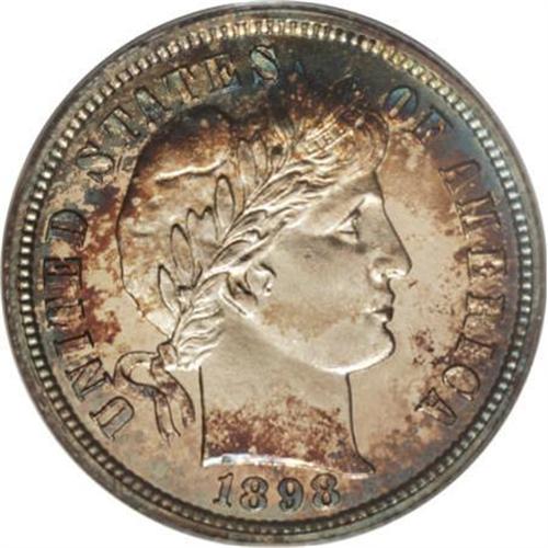 <B>1898 10C PR65 Cameo PCGS.</B></I> A goodly number of the 735-piece mintage 1898 proof dimes have survived, judging by the PCGS and NGC population figures (370 or so examples). A relatively small number, however, have rated a Cameo status. This Gem Cameo displays outstanding field-device contrast, and shows iridescent cobalt-blue, lavender, and gold-tan patina around the margins of the nicely preserved surfaces. A powerful strike emboldens all of the design features. Population: 9 in 65 Cameo, 18 finer (7/07).<BR><BR><b>Shipping:</b> Coins & Currency (<a target="_blank" href="http://www.heritageauctions.com/common/shipping.php">view shipping information</a>\)