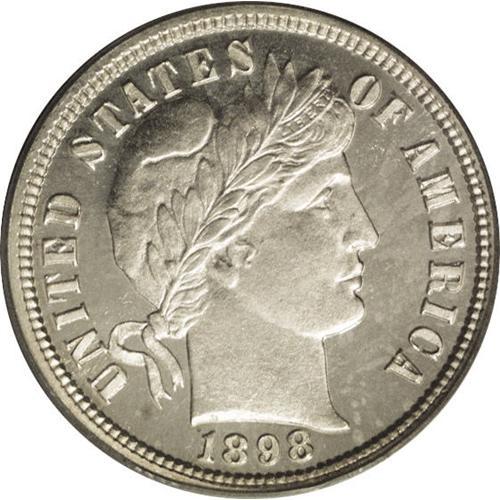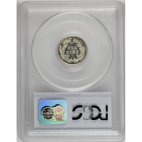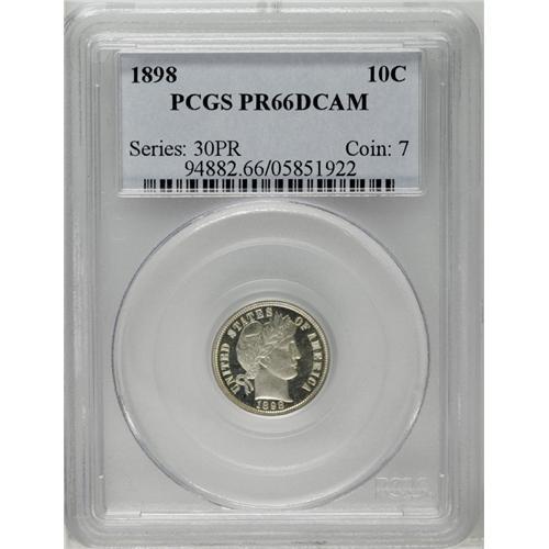 <B>1898<10C> PR66 Deep Cameo PCGS.</B></I> Both sides of this amazing proof example are sharply defined and fully brilliant with the barest trace of champagne color on the reverse. It is a sharply struck Gem proof example with a high degree of contrast between the fields and devices. Based on current certification notes, only about 5% of the surviving population of proof 1898 dimes have Deep or Ultra Cameo contrast. Population: 4 in 66, 2 finer (4/06).