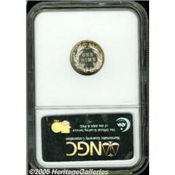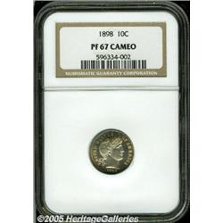 <B>1898 10C PR67 Cameo NGC.</B></I> Although not a particularly rare date in an absolute sense, few proof 1898 Dimes have survived with surfaces that are smooth as those of the present PR67 Cameo representative. Both sides are well frosted over the devices with deep glassy fields. A brilliant, mostly snow-white appearance greets the viewer although some antique-golden and cobalt-blue color remains at the borders. Population: 6 in 67 Cameo, 3 finer (2/05).