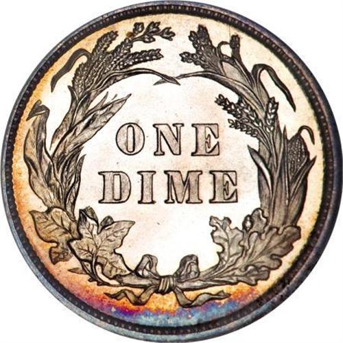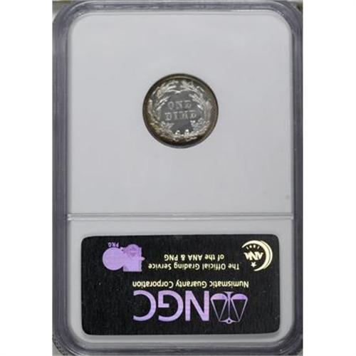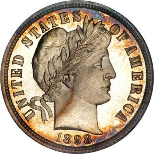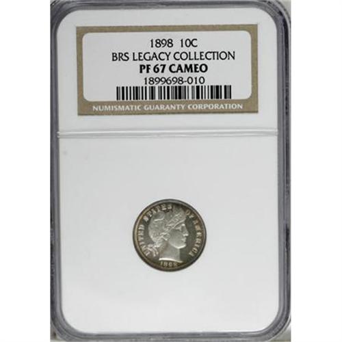 <B>1898 10C PR67 Cameo NGC.</B></I> Ex: BRS Legacy Collection. Occasional slivers of blue, purple, and gold-brown patina at the borders frame the cameoed surfaces of this lovely Superb Gem dime. Virtually pristine surfaces have benefited from a well directed strike. Census: 16 in 67 Cameo, 4 finer (11/07).<BR><BR><b>Shipping:</b> Coins & Currency (<a target="_blank" href="http://www.heritageauctions.com/common/shipping.php">view shipping information</a>)