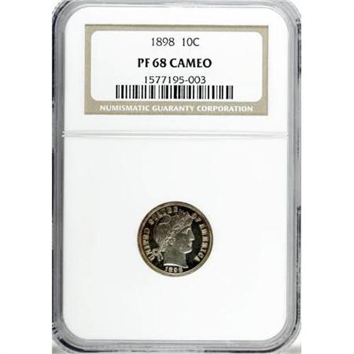<B>1898 10C PR68 Cameo NGC.</B></I> Stunning cameoed surfaces display wisps of golden-tan and lavender patination, including a sliver or two of cobalt-blue hugging the reverse rim. An attentive strike emboldens the design elements, and both faces are immaculately preserved. Census: 3 in 68 Cameo, 0 finer (9/07).<BR><BR><b>Shipping:</b> Coins & Currency (<a target="_blank" href="http://www.heritageauctions.com/common/shipping.php">view shipping information</a>)