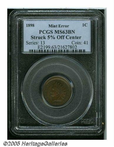 <B>1898<1C> Indian Cent--Struck 5% Off Center--MS63 Brown PCGS.</B></I> Struck slightly off center toward 6:30, however, this Select Uncirculated Indian Cent has the appearance of an uncentered broadstrike due to the broad lip of unstruck surface near 12 o'clock. A bold and unabraded golden-brown piece, traces of lilac verdigris only emerge upon thorough evaluation.<BR><I>From The Larry Rausch Collection of Errors, Part Four.</B></I>