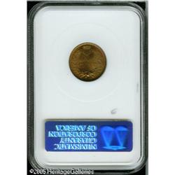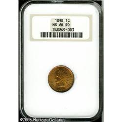 <B>1898 1C MS66 Red NGC.</B></I> This splendid premium Gem displays vibrant, frosty luster that illuminates exquisitely toned olive and red-orange surfaces. Typical slight weakness on the first three feathertips in the headdress is the only objectionable feature, and this mint-made flaw seems quite unimportant indeed, for such an impressively preserved example. Population: 26 in 66 Red, 7 finer (1/05). Lot:5243