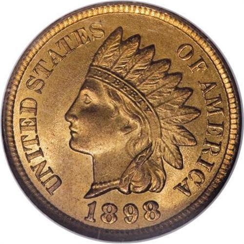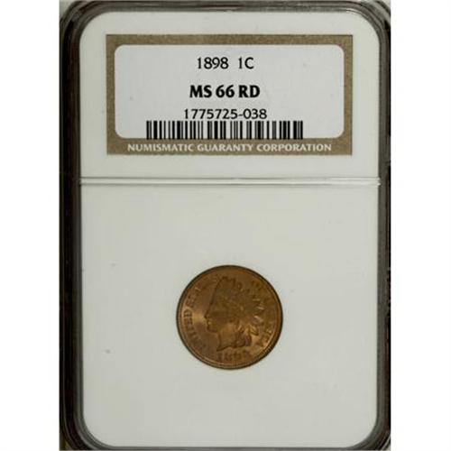 <B>1898 1C MS66 Red NGC.</B></I> This is a silky-smooth Premium Gem example with frosty luster and rich orange coloration. The design elements on both sides are quite sharp, although not fully defined. There are no spots or other blemishes to disqualify this lovely Indian from its well deserved Mint State rating. Census: 23 in 66, 7 finer (6/07).<BR><I>From The Santa Fe Collection.</B></I><BR><BR><B>Coin Engraver:</B> James B. Longacre<BR><BR><b>Shipping:</b> Coins & Currency (<a target="_blank" href="http://www.heritageauctions.com/common/shipping.php">view shipping information</a>\)