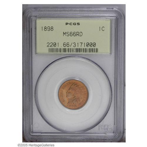 <B>1898<1C> MS66 Red PCGS.</B></I> Deep orange-red color consumes nearly all of this thoroughly lustrous premium Gem. The left obverse field and the cheek has a hint of steel-blue color, and a wisp of olive hue accompanies the lower reverse. No relevant carbon or marks are detected. Encapsulated in an old green label PCGS holder. Population: 43 in 66, 7 finer (9/05).
