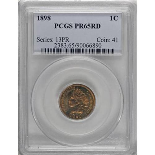 <B>1898 1C PR65 Red PCGS.</B></I> Decisively struck with surfaces that sport a lovely blend of carrot-orange and pumpkin. A tiny contact mark appears at the truncation, though this is consistent with the grade assigned. An attractive example of this late 19th century Indian proof issue. Population: 27 in 65 Red, 15 finer (8/07).<BR><BR><B>Coin Engraver:</B> James B. Longacre<BR><BR><b>Shipping:</b> Coins & Currency (<a target="_blank" href="http://www.heritageauctions.com/common/shipping.php">view shipping information</a>)