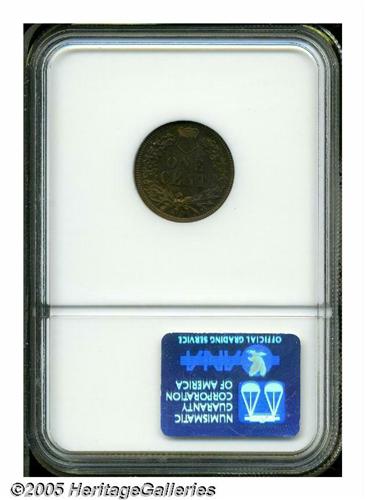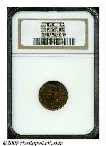 <B>1898<1C> PR67 Red and Brown NGC.</B></I> Fire-red color fills the obverse center and is bounded by subtle lime hues. The deeper toned reverse exhibits plum, gold, and olive colors. Exquisitely struck, as expected of a proof striking. A minute carbon fleck or two is of no concern.