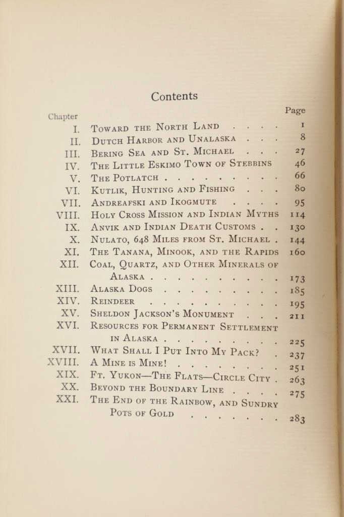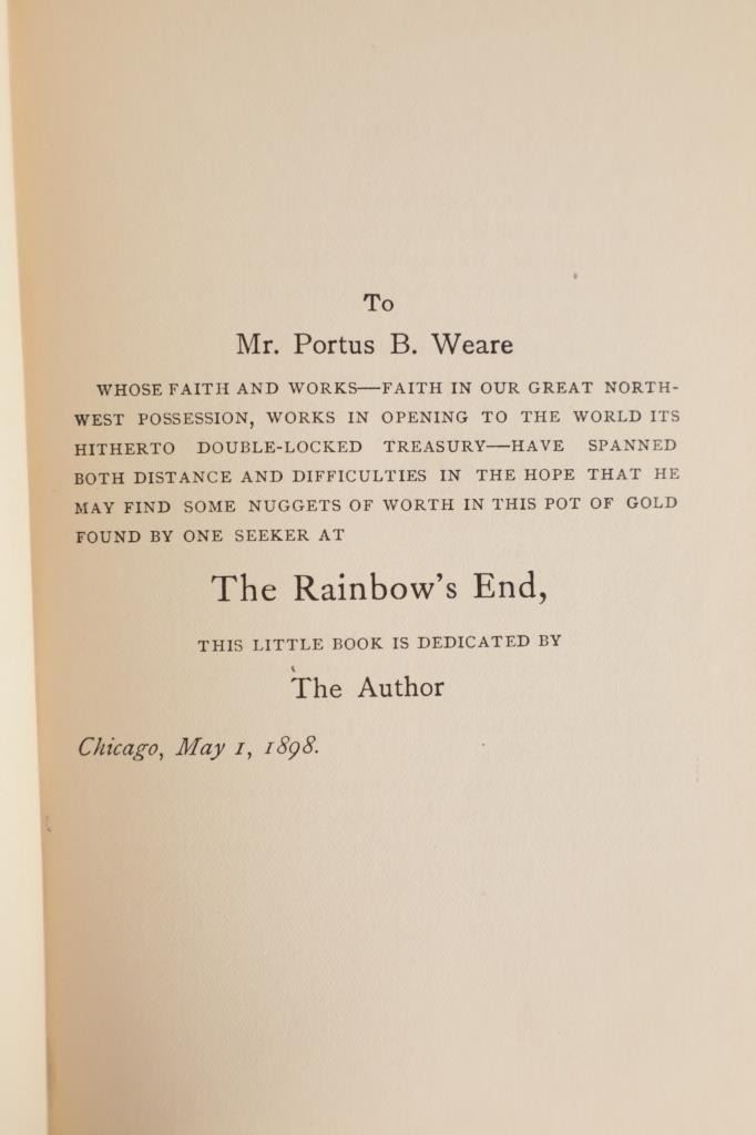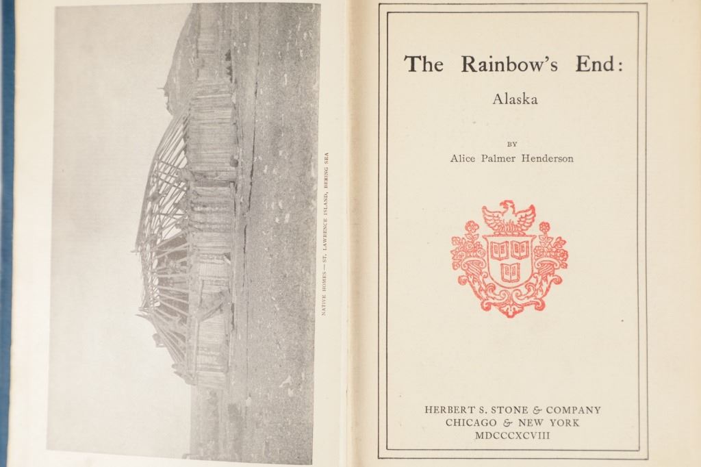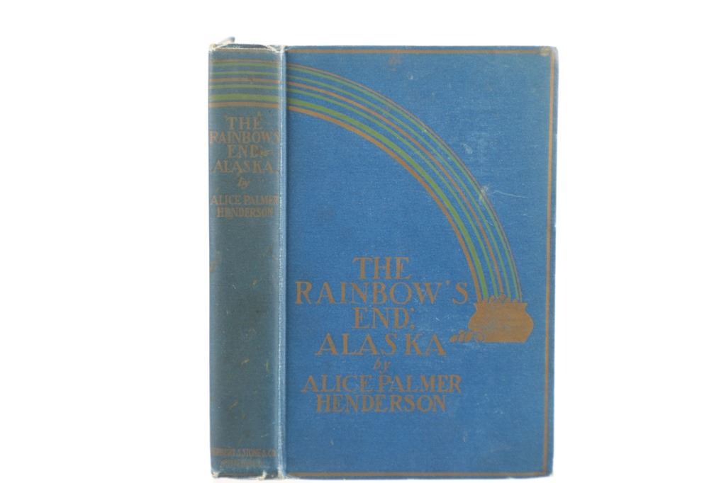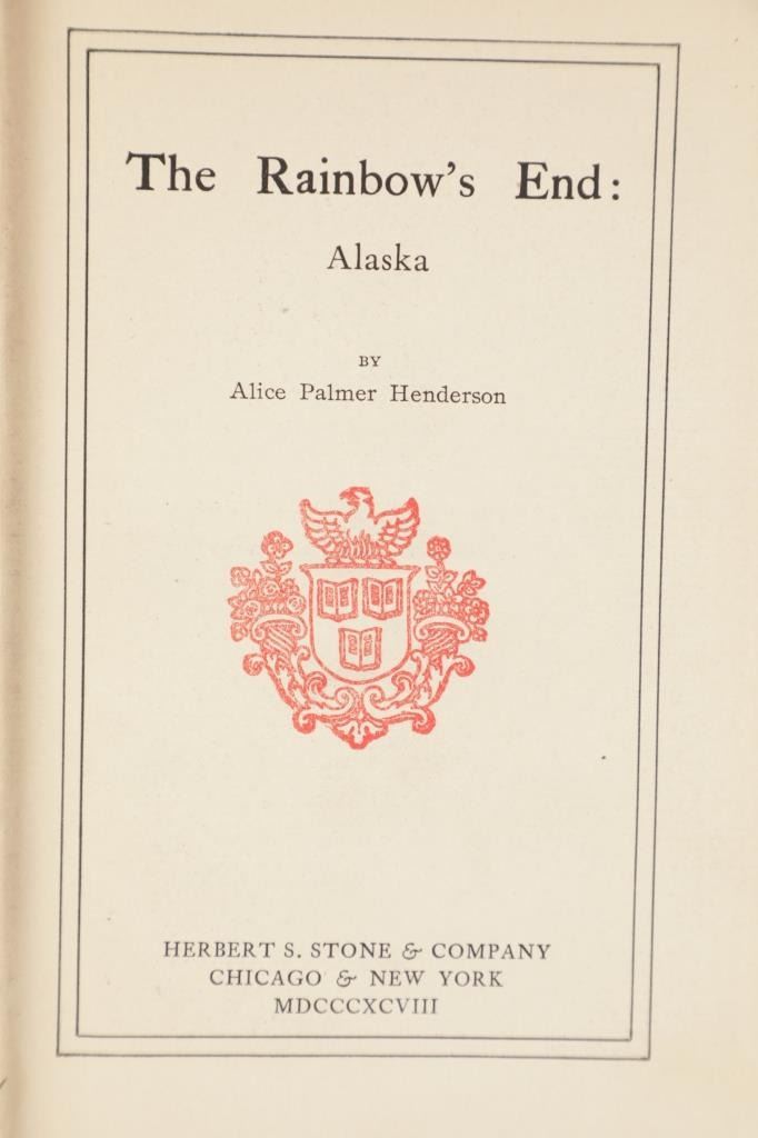 Featured in this lot is a 1898 1st edition of "The Rainbow's End: Alaska" by Alice Palmer Henderson, published and copy-righted by Herbert S. Stone & Company in Chicago and New York. The book describes the technicalities of mining, the natural history of dogs and reindeer, Indian Myths, and Christian missionary work. It also takes the reader along the Yukon into the heart of the Klondike, as well as to the Bering Sea, Dawson, and Pribyloff Islands. The book also depicts the hardships of life on the frontier as well as hunting grounds, fishery waters, the seal trade, and other topics. The book is bound in blue cloth covers and is stamped with gold gilt lettering and ornamentation on the spine and covers. The book shows slight shelf wear with some rubbing to the corners, but the spine is tight. The book measures 7 3/4" L x 5 1/8" W x 1" D. The book weighs approximately 1 pound.*