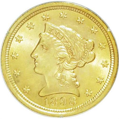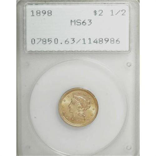 <B>1898 $2 1/2 MS63 PCGS.</B></I> . PCGS Population (149/222). NGC Census: (111/270). Mintage: 24,000. Numismedia Wsl. Price for NGC/PCGS coin in MS63: $1,150. (#7850)<BR><BR><B>Coin Engraver:</B> Christian Gobrecht<BR><BR><b>Shipping:</b> Coins & Currency (<a target="_blank" href="http://www.heritageauctions.com/common/shipping.php">view shipping information</a>)