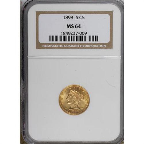 <B>1898 $2 1/2 MS64 NGC.</B></I> An amazing example with loads of eye appeal, this satiny near-Gem is sharply struck and highly lustrous.<BR><BR><b>Shipping:</b> Coins & Currency (<a target="_blank" href="http://www.heritageauctions.com/common/shipping.php">view shipping information</a>)