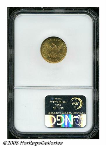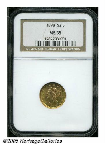 <B>1898<$2 1/2> MS65 NGC.</B></I> Thickly frosted, the surfaces are bathed in green-gold color indicating full originality. Every feature is fully defined, and both sides are typically smooth for the assigned grade. A low mintage (24,165 pieces) issue, the 1898 is also among the more conditionally challenging dates in the later Liberty Quarter Eagle series.