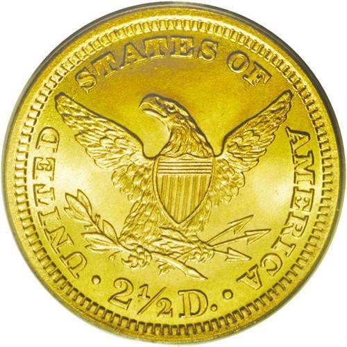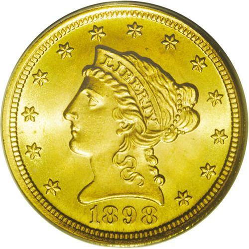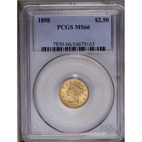 <B>1898<$2 1/2> MS66 PCGS.</B></I> The blazing cartwheel luster and a seemingly unimprovable strike only begins to describe the appeal of this well preserved Premium Gem. A wispy die crack connects the letters in OF to the rim. Only 24,000 pieces were struck, which is a small fraction of the production from the later issues of the long-lived series. Population: 26 in 66, 6 finer (5/06).
