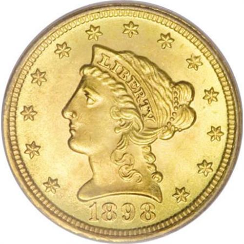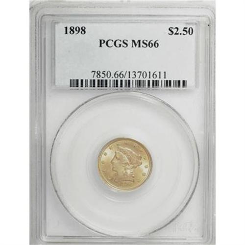 <B>1898 $2 1/2 MS66 PCGS.</B></I> The 1898 quarter eagle is not a rare date in lower grades, but it is understandably scarce at the Premium Gem Mint State level. This piece is flashy and impressive, with shimmering mint frost and delicate mint-green and pastel rose toning across both sides. The surfaces are astonishingly well preserved and nearly pristine. Few examples of business strike gold coinage from this era can boast such a high level of preservation, since collectors of that time were more interested in proofs. Population: 31 in 66, 6 finer (12/07). <BR><BR><B>Coin Engraver:</B> Christian Gobrecht<BR><BR><b>Shipping:</b> Coins & Currency (<a target="_blank" href="http://www.heritageauctions.com/common/shipping.php">view shipping information</a>)
