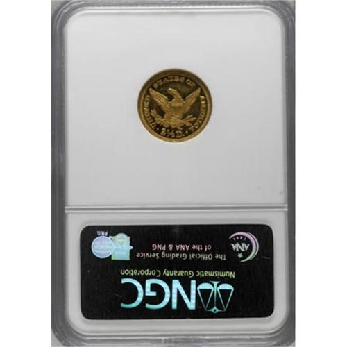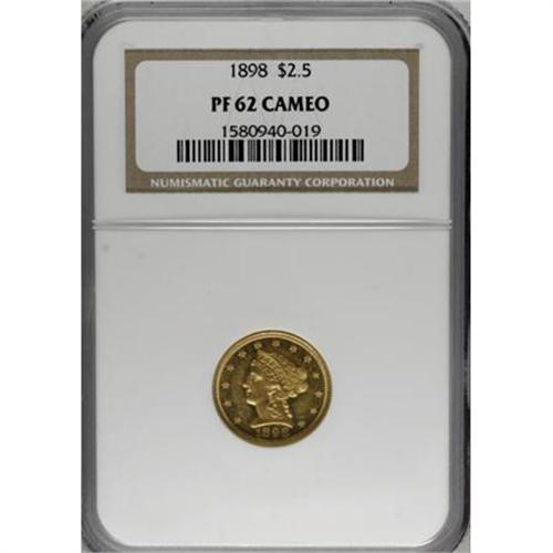 <B>1898 $2 1/2 PR62 Cameo NGC.</B></I> Unmistakably prooflike fields and rich orange-gold coloration are hallmarks of this pleasing quarter eagle. The 1898 is not a rare date, according to Garrett and Guth, with perhaps as many as 100 survivors from an original mintage of 165 pieces. This piece exhibits appealing cameo contrast, however, which increases its desirability in the numismatic marketplace. <BR><I>From The Laguna Niguel Collection, Part One.</B></I><BR><BR><b>Shipping:</b> Coins & Currency (<a target="_blank" href="http://www.heritageauctions.com/common/shipping.php">view shipping information</a>\)