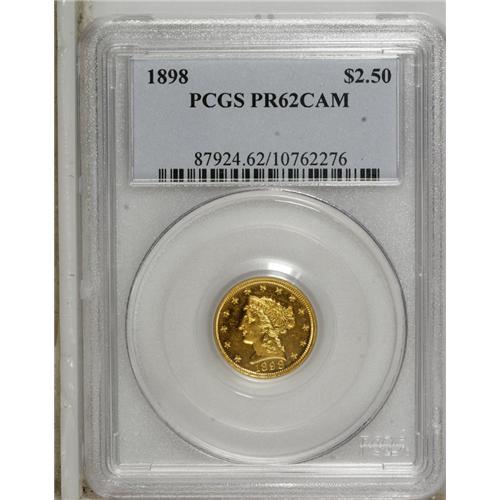 <B>1898 $2 1/2 PR62 Cameo PCGS.</B></I> A deeply reflective honey-hued specimen that comes from an original mintage of only 165 pieces. The frosted devices stand out from shining fields that have a number of grade-reducing hairlines. Population: 3 in 62 Cameo, 2 finer (1/07).<BR><BR><b>Shipping:</b> Coins & Currency (<a target="_blank" href="http://www.heritageauctions.com/common/shipping.php">view shipping information</a>)