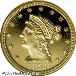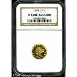 <B>1898 $2 1/2 PR64 Ultra Cameo NGC.</B></I> Only 165 proofs were struck of the 1898 quarter eagle with an estimated 55 examples extant today in all grades. This coin shows extraordinary preservation for a non-Gem with only the slightest contact marks on either side, the mint frost is thick and provides stark cameo contrast against the "black" fields. Population: 4 in 64, 23 finer (1/05).<BR><I>From The Beverly Hills Collection.</B></I> Lot:7658