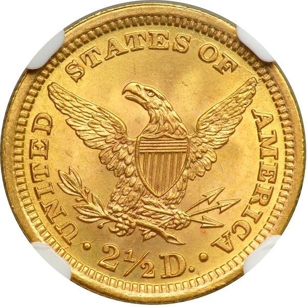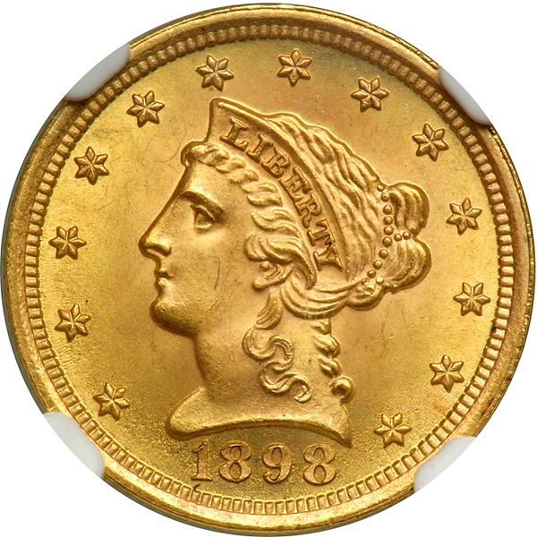 1898 $2.50 Liberty. NGC graded MS-66. Frosty and boldly struck. A lovely gem. Only 24,165 pieces minted of which 4,000 are estimated to have survived. Pop 54; 34 finer, 29 in 67, 5 in 67 Star (PCGS # 7850) .