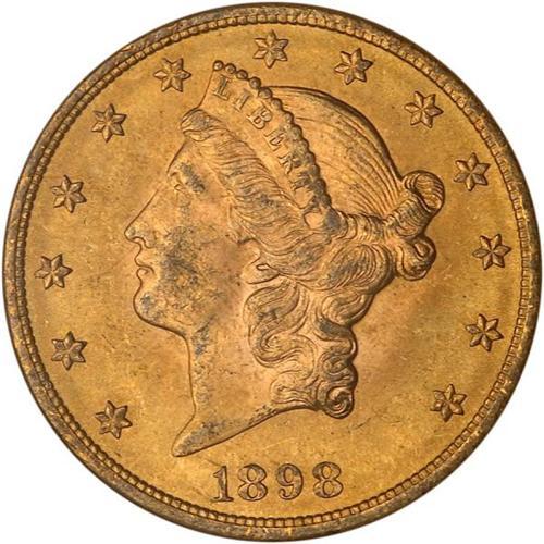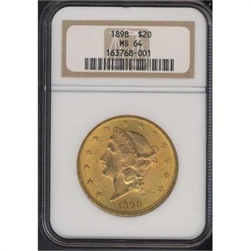<b>1898 $20 Liberty. NGC graded MS64.</b> Very approachable quality in a Liberty twenty, with splendid toning. Each side has a warm orange-gold center that is surrounded by a wide margin of just as smooth, just as frosty orange-gold color. Only a few light bagmarks to report on Liberty's face and at her throat <b>(PCGS # 9033)</b> <i>