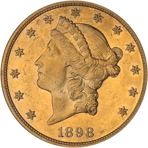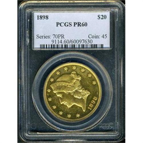 <b>1898 $20 Liberty. PCGS graded Proof 60.</b> Pop: 2/44. Nicely toned with flaxen to standard-gold metallic patina over each side. A moderately abraded yet still radiant specimen whose numerous field marks and suggestions of other impairment in its handling may point to a few short months in circulation. The delicate mirrors, however, retain much of their sparkle and smooth watery effect. This is another of the low mintage dates in Proof with a mere 75 pieces struck for sale to collectors. In those days, the few dollars premium added to the $20 base price of a double eagle was a lot of money for anyone by a well-heeled person to afford. Hence, the great rarity of Proof double eagles today!