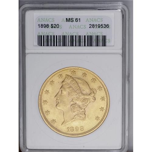 <B>1898 $20 MS61 ANACS.</B></I> Satiny and well struck with typical green-gold and pink toning and nicely preserved surfaces that only show a handful of small abrasions. With semi-reflective fields, this is an exceptionally pleasing example for the grade.