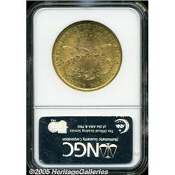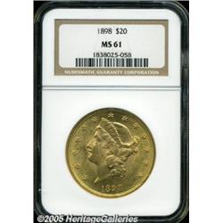 <B>1898 $20 MS61 NGC.</B></I> The design elements are sharply impressed, including nice detail on Liberty's hair, and lustrous surfaces have assumed a peach-gold patina with faint tan accents. A few light abrasions are noted over each side, particularly on the obverse.