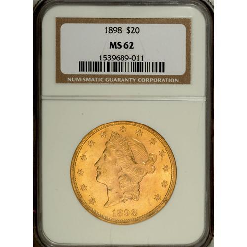 <B>1898 $20 MS62 NGC.</B></I> A lustrous example with a few barely noticeable dark places on the obverse. The reverse is well struck with mint frost.<BR><BR><b>Shipping:</b> Coin/Currency (<a target="_blank" href="http://www.heritageauctions.com/common/shipping.php">view shipping information</a>)
