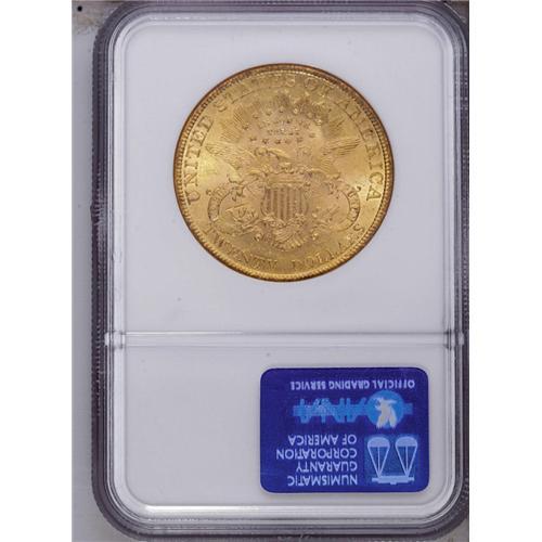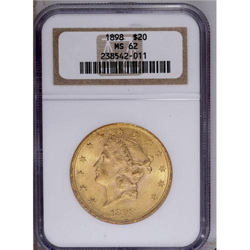 <B>1898<$20> MS62 NGC.</B></I> An excellent strike is visible on both sides, which is complemented by attractive apricot-gold patina. Numerous contact marks are scattered over each side, with the most notable occurring on Liberty's cheek and neck and in the lower left (facing) reverse field.