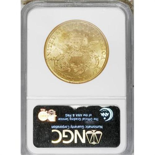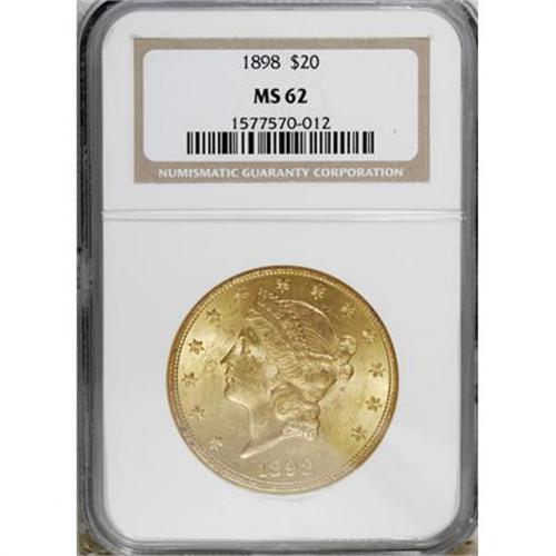 <B>1898 $20 MS62 NGC.</B></I> Strongly lustrous with a touch of satin to the orange-gold surfaces. Scattered marks and a handful of alloy streaks visit the areas on and near Liberty's portrait.<BR><BR><B>Coin Engraver:</B> James B. Longacre<BR><BR><b>Shipping:</b> Coins & Currency (<a target="_blank" href="http://www.heritageauctions.com/common/shipping.php">view shipping information</a>)