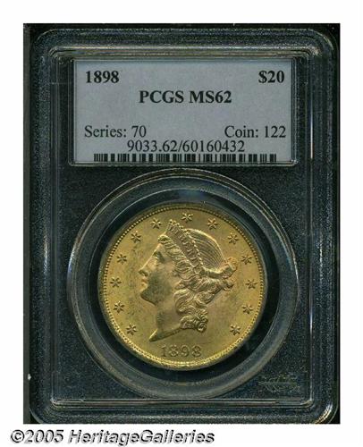<B>1898<$20> MS62 PCGS.</B></I> The 1898 is a scarce date in strictly Uncirculated condition, and becomes rare in MS65 and above. The MS62 example offered here has honey-gold patina with subtle light green undertones. The surfaces display soft luster, and a few minute marks and scuffs, especially on the obverse.